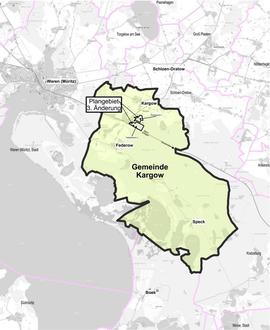 Der räumliche Geltungsbereich des Bebauungsplanes umfasst eine Fläche von ca. 8,1 ha. Das Plangebiet betrifft die Flurstücke 364/2 und eine Teilfläche aus 365/1 der Flur 2, Gemarkung Kargow. Bei der Vorhabenfläche handelt es sich um eine zwischenzeitlich genutzte Ackerfläche, die sich größtenteils innerhalb des Rahmenbetriebsplanes für einen Kiestagebau befindet.
