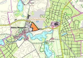 Übersichtsplan mit Lage des Geltungsbereiches des vorhabenbezogenen Bebauungsplanes Nr. 8 der Gemeinde Hohen Wangelin (orange hinterlegt und gestrichelt schwarz umrandet)