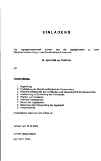 Die Jagdgenossenschaft Lansen lädt die Jagdgenossen zu einer Mitgliederversammlung in das Gemeindehaus Lansen am 17. April 2026 um 19:00 Uhr ein.