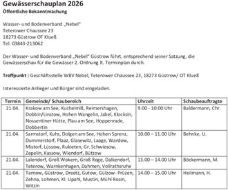 Der Wasser- und Bodenverband „Nebel“ Güstrow führt, entsprechend seiner Satzung, die Gewässerschau für die Gewässer 2. Ordnung lt. Terminplan durch.