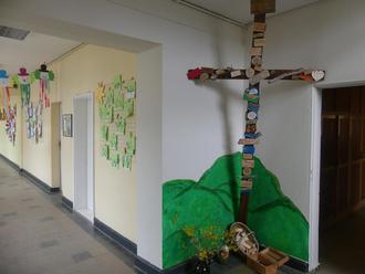 Sich nicht nur mit der biblischen Historie auseinanderzusetzen, sondern im Gedanken auf Verzicht und Besinnung die eigene Beziehung zu Gott zu beschreiben, war Anlass für die Neuerrichtung und Gestaltung eines Holzkreuzes, welches durch selbsterstellte „Schildchen“ mit Wünschen, Bitten und Danksagungen gestaltet wurde. Jedes individuell gestaltet, wie auch die Beziehung zu Glaube und Gott individuell ist.