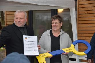 Es war kein Aprilscherz! Am 01.04.2023 erfolgte nun endlich die Schlüsselübergabe für unser lang ersehntes Vereinsheim! Unser Bürgermeister Enrico Malow hat mit der Gemeindevertretung Grabowhöfe durch Hartnäckigkeit und Stehvermögen bewiesen, dass auch in schwierigen Zeiten etwas möglich ist. Nach 1 Jahr Bauzeit ging unser jahrelanger Wunsch von einem eigenen Heim auf unserem Sportplatz in Erfüllung.