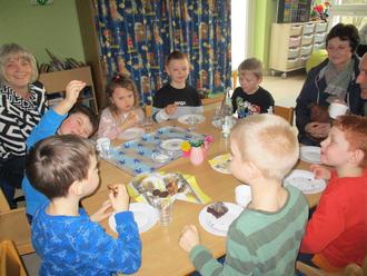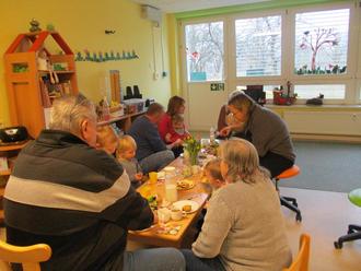 Der selbstgebackene Kuchen der Kinder und Erzieherinnen wurde gemeinsam mit den Großeltern bei Kaffeetrinken verspeist. Es wurde zusammen gespielt, gelacht und gebastelt. Es war für alle ein erlebnisreicher Nachmittag.
