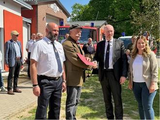 Nun ist die Finanzierung rund. Der Innenminister des Landes Mecklenburg-Vorpommern, Christian Pegel, hat am 8. Mai 2024 eine Fördermittelzusage aus dem Topf der Sonderbedarfsmittel des Landes M-V über 155.000 € dem Bürgermeister Johannes Güssmer und dem Wehrführer Mario Nagel als Anteilsfinanzierung des Landes M-V übergeben.