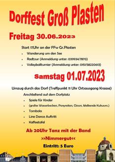 Am 01. Juli 2023 findet in Groß Plasten wieder das Dorffest statt.