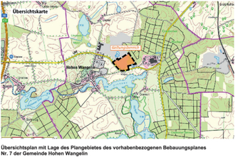 Die Gemeindevertretung der Gemeinde Hohen Wangelin hat in öffentlicher Sitzung am 25.10.2022 für den in anliegender Übersichtskarte gekennzeichneten Geltungsbereich die Aufstellung des vorhabenbezogenen Bebauungsplans Nr. 7 "Freiflächensolaranlage ehemalige Kiesabbaufläche" nordöstlich der Liepener Straße beschlossen.