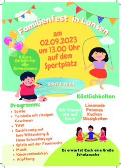 (at) Der Sommer neigt sich – die Tage werden zwar kürzer, sind jedoch noch angenehm warm. Ideal für Aktivitäten mit der ganzen Familie und was liegt da näher als einmal die Gegend erkunden. Am Sonnabend des ersten Septemberwochenendes lädt die Gemeinde Peenehagen zum Familienfest nach Lansen auf dem Fest- und Sportplatz ein. Hier hat ein jeder Glück, denn bei der großen Tombola gewinnt jedes Los und aus allen Losen wird es zum Ende nochmals die Chance auf Hauptgewinne geben. Die Einnahmen der Tombola sind für einen guten Zweck gedacht und kommen der Jugendfeuerwehr und der Kita in der Gemeinde zu Gute.