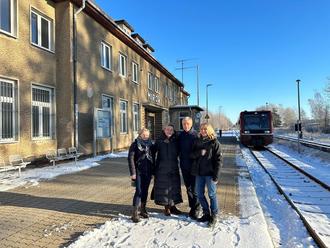 Bürgermeister Henry Tesch mit Architektin Kerstin Heller (1v.r.), Geschäftsführerin Anna Doss (3v.r.) und Anja Serjogin (1.v.l.) von der Wobau-Mirow beim Termin zur weiteren Umsetzung der Planungen am Bahnhof Mirow.