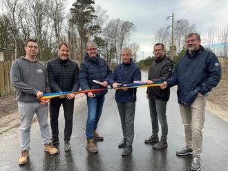 Sind zufrieden mit dem Ergebnis v.l.n.r.: Hieronymus Köpp und Lutz Arndt von der STRABAG, Frank Rahn, Bürgermeister Henry Tesch, Bauamtsleiter Thomas Reggentin und Christian Voigt vom Sachgebiet Bauen und Objektverwaltung bei der offiziellen Inbetriebnahme der Straße.
