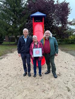 Ingelore Festerling (Mitte) und Ehemann Christian (rechts) gemeinsam mit Bürgermeister Henry Tesch an der neuen Rutsche, zu der sie beigetragen haben.
