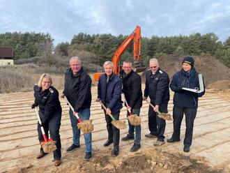 Beim ersten Spatenstich: Jugendwartin Julia Berdermann, stellvertretende Landrat Thomas Müller, Bürgermeister Henry Tesch, Geschäftsführer Baukonzept Neubrandenburg Thorsten Haker, Wehrleiter Wilfried Staff und Amtswehrführerin Anke Krüger (von links).