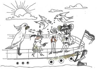 As dat Schipp nu fröhmorgens in Bergen ankem, fauderte een Birkesdörper Mann, Charles, Möwen mit Fleesch- un Brotbrocken up`n Schippsbug. Dee sehg verwirrt ut un schien bannig dörcheenanner to sien! Coco kreeg denn` Himphamp mit, un wull Charles von sien Driewen afhollen. He reep: „Oh, oh hür up mit dissen Mess, Charles, sowat makt man nich!“ Dat stürte denn` Kierl oewer gor nich, he schmet ümmer nieges Fauder in de Hööchd! Dunn passierte dat Mallür: Een groten Klacks Möwenschiet druppte up denn` schicken Hoot von uns` couragierten Badenerin, dee graad een Morgenspaziergang ünnernehm! Wat hett de Ollsch zackeriert - se wull Charles sogor verklagen, de Fruu künn sick kuum beruhigen!