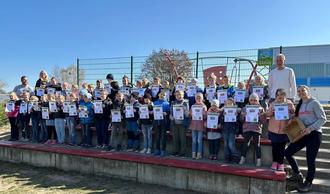 Die jetzigen 2. Klässler mit ihren Zertifikaten. Schulleiter Marvik Fischer (2. Reihe 1. v. l.) sowie Projektleiterin Alexa Beaucamp (1. Reihe,1.v.r.) und Henry Tesch, Bürgermeister Mirow (2. Reihe 2. v. r.).