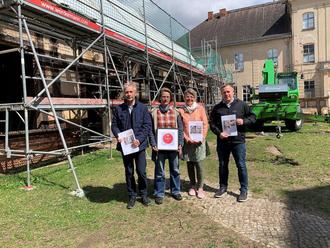 Bettina Strauß (2. v. l.) mit Bürgermeister Henry Tesch (1. v. l.), Claudia Lamm (3. v. l.) und Kämmerer Andreas Franz (4. v. l.) im Innenhof vorm Flügelgebäude.