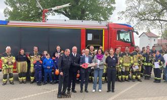 Feierliche Schlüsselübergabe für das neue Tankfahrzeug TLF 4000 mit Bürgermeister Henry Tesch (Mitte), Ortswehrführer Ingo Mahnke (1.v.l.), Thomas Müller (2.v.l.), stellvertretender Landrat, Ines Heinrich als Vertreterin der Firma Rosenbauer (4.v.l.) und Amtswehrführerin Anke Krüger (5.v.l.)