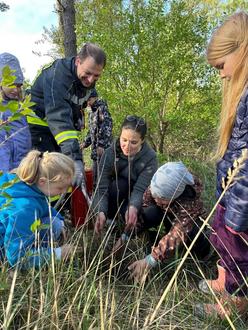 Amtswehrführerin Anke Krüger von der Freiwilligen Feuerwehr Mirow und Förster Hubert Beese mit den Grundschülerinnen und Grundschülern beim setzen der Bäume im Schulwald Carolinum,