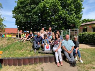 Freude bei Groß und Klein während der Übergabe der Ehrung. Fühlen sich alle sehr wohl im Familienzentrum Mirow e.V.! Hier die Vorschulkinder des diesjährigen Jahrganges gemeinsam mit Bürgermeister Henry Tesch (1.v.l.) und Vorstandsvorsitzender Gabi Haack (2.v.l.)!
