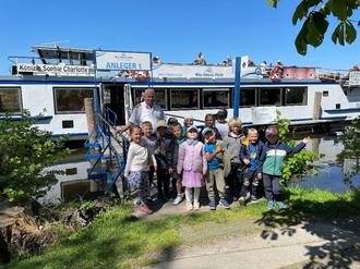 Während unseres Besuchs kam die Wasserschutzpolizei an Bord, um eine Kontrolle durchzuführen. Sie überprüften, ob alles mit rechten Dingen zugeht: Sie kontrollierten, ob der Kapitän einen gültigen Führerschein besitzt, damit er das Schiff sicher steuern darf, und ob alle Sicherheitsvorschriften eingehalten werden. Das war spannend zu sehen, denn so erfuhren die Kinder, warum solche Kontrollen wichtig sind, damit alle sicher unterwegs sind.