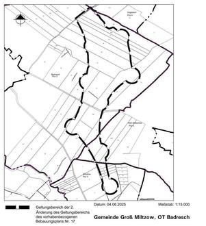 Die Gemeindevertretung der Gemeinde Groß Miltzow hat aufgrund der beabsichtigten Roto-In-Planung am 19.06.2024 die 2. Änderung des Geltungsbereichs des vorhabenbezogenen Bebauungsplanes Nr. 17 „Windpark Badresch“ der Gemeinde Groß Miltzow“ beschlossen.