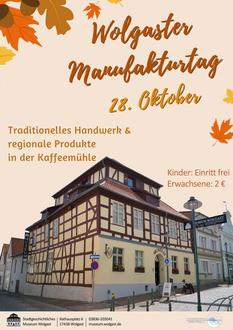 Der 3. Manufakturtag in der Wolgaster Kaffeemühle steht vor der Tür. Am 28. Oktober 2023 präsentieren Profis aus der Region traditionelles Handwerk zum Anfassen und Mitmachen in der Wolgaster Kaffeemühle. Von 10:00 bis 17:00 Uhr können Groß und Klein in der historischen Atmosphäre des 300-jährigen Fachwerkbaus mit Handwerkerboden traditionelles Handwerk hautnah miterleben und selbst mitwirken. Unser vielfältiges Angebot bietet unter anderem Einblicke in die Zeit der Papier- und Seifenmanufaktur, des Körbeflechtens und des Teppichknüpfens. Passend zur aktuellen Mühlenausstellung sind auch zwei Museumsmüller vor Ort. Zeitgleich öffnet die Wolgaster Braukultur zum Schaubrauen den Rathauskeller. Zum Manufakturtag gilt ein ermäßigter Eintritt von 2 € pro Person. Für Kinder bis 16 Jahre ist der Eintritt frei! Wir freuen uns auf Ihren Besuch.