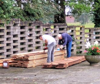 Daneben hat sich ein weiteres Team mit der Reparatur bzw. Erneuerung der Konservierung und Verschalung der Hochblenden auf dem 50 m GK Stand im Waldbereich beschäftigt. Dazu gehörte auch der Anstrich der vorgesehenen Bretter für die Verschalung.