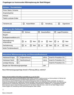 Hierzu wird eine sogenannte Bestandsanalyse, der Ist-Zustand, erstellt. Darin werden der derzeitige Wärmeverbrauch, die eingesetzten Energieträger, die vorhandenen Wärmeerzeugungsanlagen und die vorhandene Wärmeinfrastruktur ermittelt. Hierzu wird Ihre Mithilfe benötigt. Um den IST-Stand zielführend zu erfassen und so wenig Schätzwerte wie möglich in die Analyse einfließen zu lassen, benötigen wir konkrete Verbrauchsdaten der Einwohnerinnen und Einwohner, sowie von Unternehmen und Einrichtungen. Viele Daten kennen wir. Dazu zählt der Verbrauch der Schulen und Verwaltungsgebäude und der Bedarf der großen Wohnungsanbieter (WGW und WoWi). Jedoch gibt es noch viele weitere Verbraucher im Stadtgebiet, deren Daten wir nicht kennen. Diese bitten wir den anliegenden Fragebogen auszufüllen.