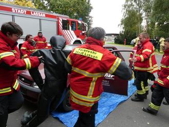 Gemeinsam stabilisierten wir das Fahrzeug und trainierten verschiedene Möglichkeiten Scheiben zu entfernen, Seitenöffnungen zu schaffen und das Dach zu entfernen, um so unseren Dummy Hildegard zu retten.
