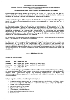 Der Entwurf des vorhabenbezogenen Bebauungsplanes Nr. 1 „Agri-Photovoltaikanlage Bauer – nördlich des Brebowbaches“ im OT Bauer mit der Planzeichnung (Teil A), Text (Teil B), dem Vorhaben- und Erschließungsplan, der Begründung, dem Umweltbericht, dem Ergebnisbericht faunistischer Erfassungen, der gutachterlichen Stellungnahme zur Einschätzung von potenziellen Blendwirkungen, dem Agri-PV Konzept und den nach Einschätzung der Gemeinde wesentlichen, bereits vorliegenden Stellungnahmen wird gemäß § 3 Abs. 2 BauGB