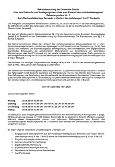 Der Entwurf des vorhabenbezogenen Bebauungsplanes Nr. 2 „Agri-Photovoltaikanlage Seckeritz - nördlich des Apfelweges" im OT Seckeritz bestehend aus Planzeichnung (Teil A), Text (Teil B), dem Vorhaben- und Erschließungsplan, der Begründung, dem Umweltbericht, dem Ergebnisbericht faunistischer Erfassungen, der gutachterlichen Stellungnahme zur Einschätzung von potenziellen Blendwirkungen, dem Agri-PV Konzept und den bereits vorliegenden umweltbezogenen Stellungnahmen wird gemäß § 3 Abs. 2 BauGB