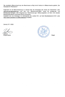 Die ortsübliche Bekanntmachung des Beschlusses erfolgt durch Abdruck im Bekanntmachungsblatt „Der Amtsbote Am Peenestrom“.