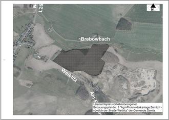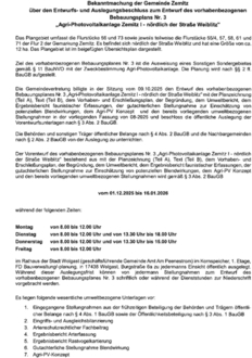 Die Gemeindevertretung billigte in der Sitzung vom 09.10.2025 den Entwurf des vorhabenbezogenen Bebauungsplanes Nr. 3 „Agri-Photovoltaikanlage Zemitz I - nördlich der Straße Weiblitz" mit der Planzeichnung (Teil A), Text (Teil B), dem Vorhaben- und Erschließungsplan, der Begründung, dem Umweltbericht, dem Ergebnisbericht faunistischer Erfassungen, der gutachterlichen Stellungnahme zur Einschätzung von potenziellen Blendwirkungen, dem Agri-PV Konzept und den bereits vorliegenden umweltbezogenen Stellungnahmen in der vorliegenden Fassung von 08-2025 und beschloss die öffentliche Auslegung der Vorentwurfsunterlagen nach § 3 Abs. 2 BauGB.