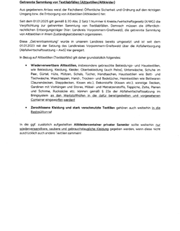Aus gegebenem Anlass weist der Fachdienst Öffentliche Sicherheit und Ordnung auf den richtigen Umgang bzw. die Entsorgung von Alttextilien (Altkleidern) hin: