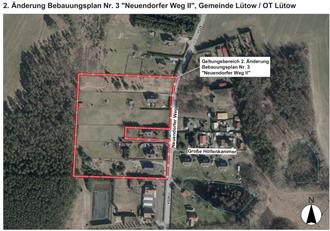 Der Geltungsbereich der 2. Änderung des Bebauungsplanes Nr. 3 „Neuendorfer Weg II“ umfasst die Flurstücke 53/2, 54/3, 55/2, 56/6, 57/3 und 58/2 der Flur 5 der Gemarkung Neuendorf. Das Plangebiet hat eine Größe von 2,63 ha und befindet sich westlich des Neuendorfer Weges im Ortsteil Lütow. Die Lage ist im beigefügten Übersichtsplan dargestellt.