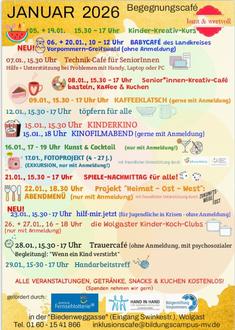 Das Jahr 2026 startet mit 19 Veranstaltungen im Januar, darunter zahlreiche stets beliebte Angebote wie zum Beispiel den Kinder-Kreativ-Kursen, den inzwischen zwei Wolgaster Kinder-Koch-Clubs, „töpfern für alle“, „Kaffeeklatsch“ oder dem Senioren-Kreativ-Café und dem Technik-Café.