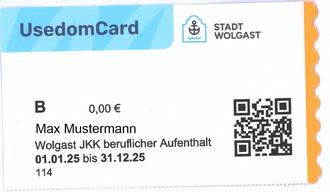 Übernachtungsgäste der Stadt Wolgast, der Gemeinde Krummin und der Gemeinde Sauzin erhalten ihre UsedomCard ab dem 01.01.2025 über den Gastgeber.Die UsedomCard wird auf den Namen der abgabepflichtigen Person ausgestellt. Sie ist nicht übertragbar und gilt für die angegebene Dauer. Davon ausgenommen sind Kinder unter 6 Jahren.