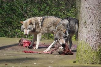 Ein sehr seltenes Spektakel im Wolfsgehege des Tierpark Wolgast erlebten Besucher und Mitglieder der Presse am 3. Mai 2023. Auf der Holzplattform in der Mitte der rund 5000 m2 großen Anlage trafen ausnahmsweise die beiden sonst sehr scheuen Bewohner des Geheges aufeinander, um das dort an einem Stamm aufgehängte tote Reh zu fressen. Den Leckerbissen gab es anlässlich des Geburtstags von Wölfin Sonja, die an diesem Tag 16 Jahre alt wurde. Normalerweise das Hoheitsgebiet von Artgenosse „Solo“, der sein Futter ungern teilt, trottete die Seniorin ebenfalls auf die Plattform und riss ein paar Stücke aus der Ricke.