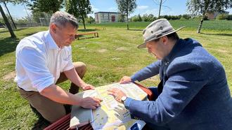 Der Landrat Michael Sack (l.) und der Bürgermeister Martin Schröter (r.) im Gespräch zum geplanten Schulcampus am zukünftigen Standort.