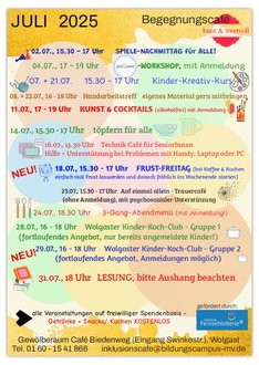 Einige Angebote erfreuen sich seit längerem besonderer Aufmerksamkeit: das Trauercafé mit psychosozialer Begleitung, das Technik-Café für Seniorinnen und Senioren (hier geht es um konkrete Hilfestellung im Umgang mit Handy oder Laptop), die Workshops zu Selbsthilfethemen oder auch „Kunst & Cocktail“ – bunte kreative Abende mit alkoholfreien Cocktails. Ein besonderer „Renner“ war von Beginn an der „Wolgaster Kinder-Koch-Club“, in dem sich eine feste Gruppe von 12 Kindern regelmäßig trifft, um mit viel Spaß die Grundbegriffe des Kochens und Backens zu erlernen und natürlich gemeinsam zu essen. Im Juli startet hierzu eine zweite Gruppe, für die noch Anmeldungen möglich sind. Ein weiteres neues Angebot ab Juli: am „Frust-Freitag“ einfach mal gemeinsam bei Kaffee und Kuchen über den Frust der Woche reden und dann gemeinsam fröhlich ins Wochenende starten.