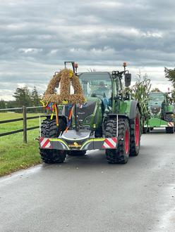 An vielen Stellen des Weges hatten sich Zuschauer eingefunden, winkten den Feiernden auf den Umzugswagen zu und freuten sich am Anblick der schön geschmückten Fahrzeuge. Dann machten sich alle auf den Weg zum Festzelt am Gemeindehaus. Als sich alle dort eingefunden hatten, wurde die Erntekrone zum Festzelt gebracht und dort aufgehängt.