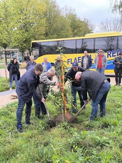 Der Wittenburger Bürgermister Christian Greger (li). und sein Löninger Kollege Burkhard Sibbel (re.) erhielten tatkräftige Hilfe bei der Baumpflanz-Challenge