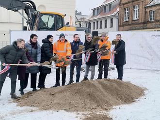 Wir haben hier im Stadt- & Landboten ja schon einiges über die Planungen und Konzepte zum neuen Verwaltungssitz neben dem historischen Rathaus berichtet. Jetzt soll es endlich losgehen mit der Umsetzung – sofern das Wetter mitspielt. Im derzeit hartgefrorenen Boden sind die geplanten Erkundungsgrabungen erst einmal nicht möglich. So musste auch der symbolische 1. Spatenstich am 2. Februar in einem aufgeschütteten Kieshügel stattfinden.