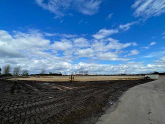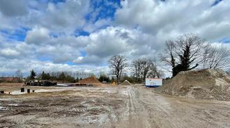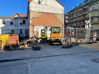 Die Abbruch- und Aufräumarbeiten auf dem Grundstück sind abgeschlossen. Derzeit laufen die Arbeiten zur Vorbereitung einer geraden und tragfähigen Grundstücksoberfläche für den Bau eines Lebensmittelmarktes (Vollsortimenter REWE).
