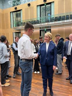 Das Highlight am Dienstagnachmittag war die Zusammenkunft mit Ministerpräsidentin und Bundesratspräsidentin Manuela Schwesig. In einer Fragerunde konnten wir uns nicht nur Tipps für die nächsten Verhandlungen von ihr abholen, sondern auch einen interessanten Einblick in ihr politisches Leben bekommen. In der Diskussionsrunde im Plenarsaal hob die Bundesratspräsidentin hervor: „Ich freue mich sehr über euer Interesse. Demokratie lernt man nicht nur theoretisch aus dem Schulbuch. Demokratie muss man üben und erleben. Das kritische Hinterfragen, das Aushalten anderer Meinungen. Demokratie fängt im Alltag an. Auch im Schulalltag.“