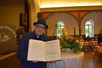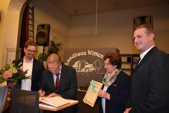 Anschließend bat Bürgermeister Christian Greger Pfarrer Schultz sich in das Ehrenbuch der Stadt Wittenburg einzutragen. Die folgende persönliche Widmung schrieb er in das Ehrenbuch: „Mit den Worten des Schriftstellers Manfred Hausmann schaue ich auf meine Heimatstadt Wittenburg mit den besten Wünschen! „Allem danke ich und allen.“