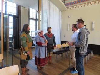 Eine slawische Fürstin erschien mit ihren zwei Kriegern im Rathaussaal, um ihnen Einladungen zum „Burgmannenlager“ auf dem Amtsberg in Wittenburg zu überbringen. Die Einladungen sind ein Dankeschön für die Unterstützung und die Schirmherrschaft der Stadt Wittenburg. Diese Überraschung konnte nur gelingen mithilfe von Frau Bauer und Frau Owszak vom Amt, die die zwei zum Rathaus gelotst haben. Unsere Einladungen wurden mit Freude angenommen.