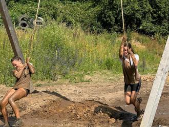Nach der Erwärmung ging es an den Start und gleich um die erste Kurve erwartete uns eine riesige Pfütze, durch die wir nun durchmussten und dann die nächste Herausforderung ein Riesenrutsche mit Strohballen als Auffangbereich – es kostete Überwindung – alternativ war aber auch ein Seil an der Seite gespannt, sodass man auch durch Modder nach unten kam.