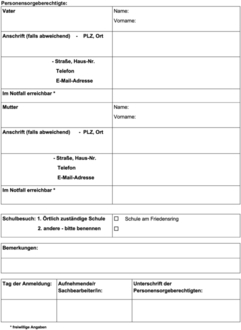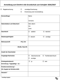 Zur Anmeldung bringen Sie bitte das ausgefüllte untenstehende Anmeldeformular „Anmeldung zum Eintritt in die Grundschule zum Schuljahr 2026/2027“ sowie das Familienbuch bzw. eine Geburtsurkunde des Kindes mit. Ebenso ist es erforderlich, eine Negativbescheinigung vorzulegen, sollten Sie alleinerziehend sein.