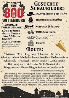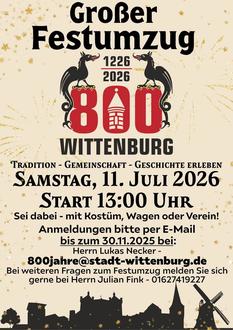 die Vorbereitungen für unser Stadtjubiläum laufen auf Hochtouren - und der Höhepunkt wird der große Festumzug am Samstag, 11. Juli 2026 sein. An diesem Tag verwandelt sich Wittenburg in eine lebendige Bühne, auf der wir gemeinsam 800 Jahre Stadtgeschichte Revue passieren lassen: vom Mittelalter bis in die Gegenwart, von Zünften und Kutschen bis hin zu modernen Vereinen und Firmen.