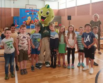 Zur großen Freude der Schülerinnen und Schüler brachte die AOK Nordost neben ihrem Maskottchen, dem Drachenkind Jolinchen, auch Zahnputzbecher mit Zahnbürste und Zahnseide für die Erstklässler mit. Abschließend zeigten die zwei Clowns Pipo & Pipolina den Schülerinnen und Schülern der ersten und zweiten Klassen auf lustige und unterhaltsame Art, dass ein Besuch beim Zahnarzt spaßig sein kann. Es war ein rundum gelungener Tag, der den Schülerinnen und Schülern viel Freude bereitete.