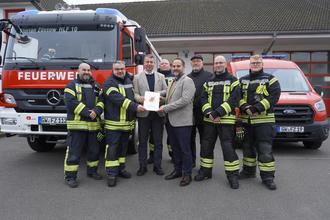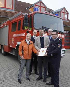 Der nächste Stopp für den Landrat war im Feuerwehrgerätehaus in Züssow. Auch hier wurde ein Zuwendungsbescheid an den Bürgermeister und die Kameraden der Freiwilligen Feuerwehr Züssow in Höhe von 111.067,00 Euro überreicht. Die Gemeinde Züssow hat laut Brandschutzbedarfsplanung den Bedarf für ein Tanklöschfahrzeug und dieses wird durch Abruf eines Fahrzeuges aus der Landeszentralbeschaffung des Landes Mecklenburg-Vorpommern beschafft. Auch hier durfte anschließend der Austausch mit dem Bürgermeister und Kameraden der Freiwilligen Feuerwehr Züssow nicht fehlen.